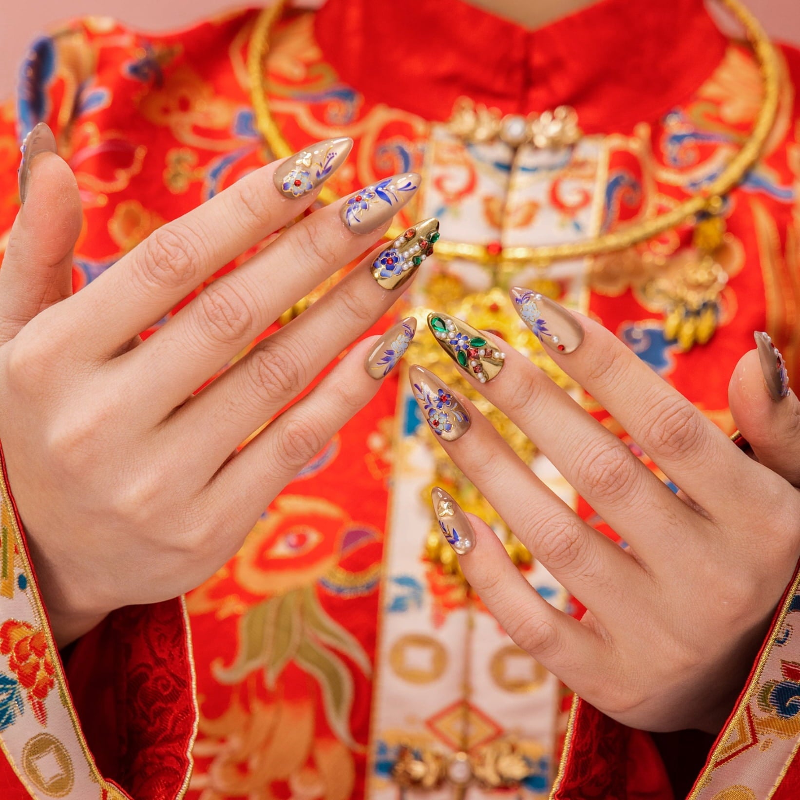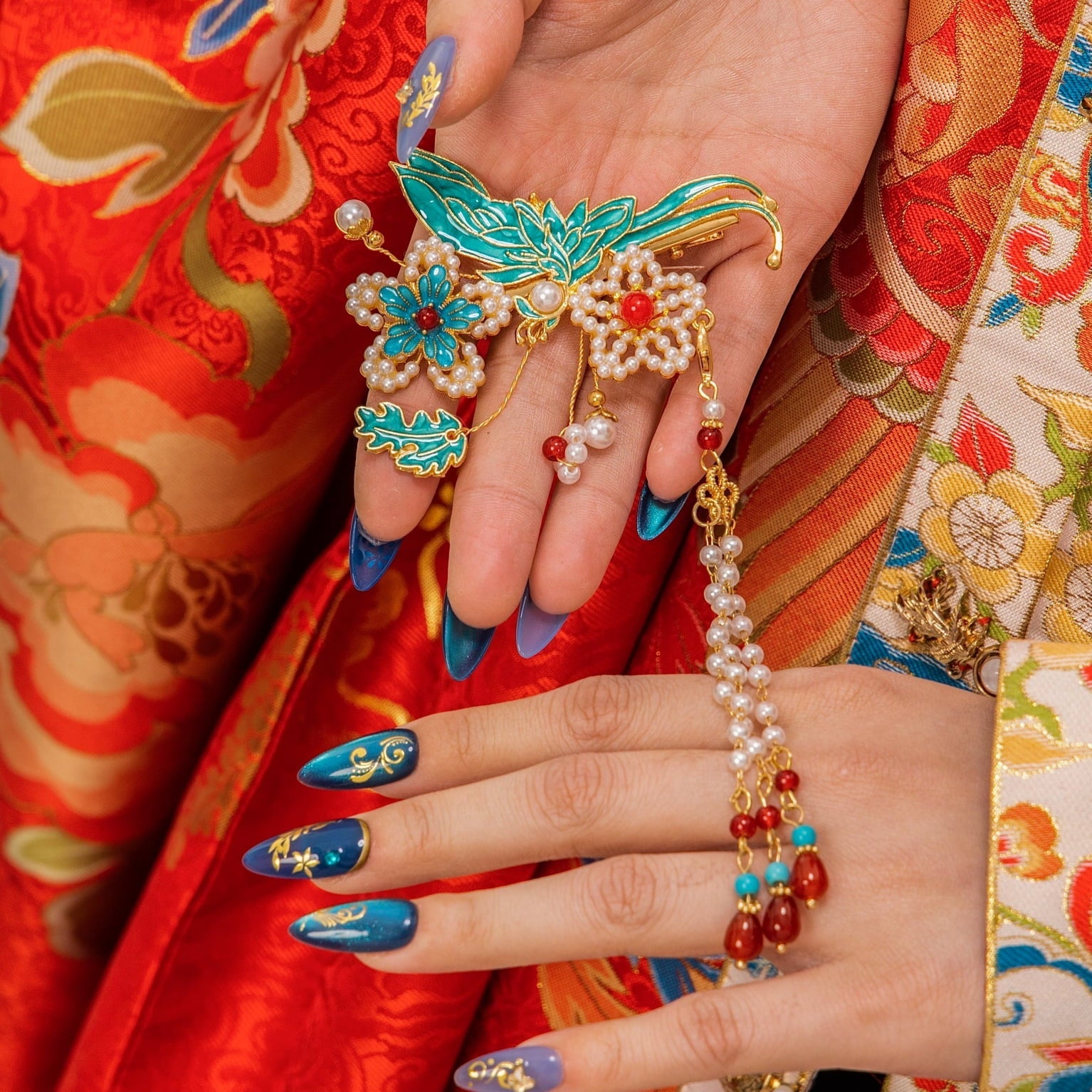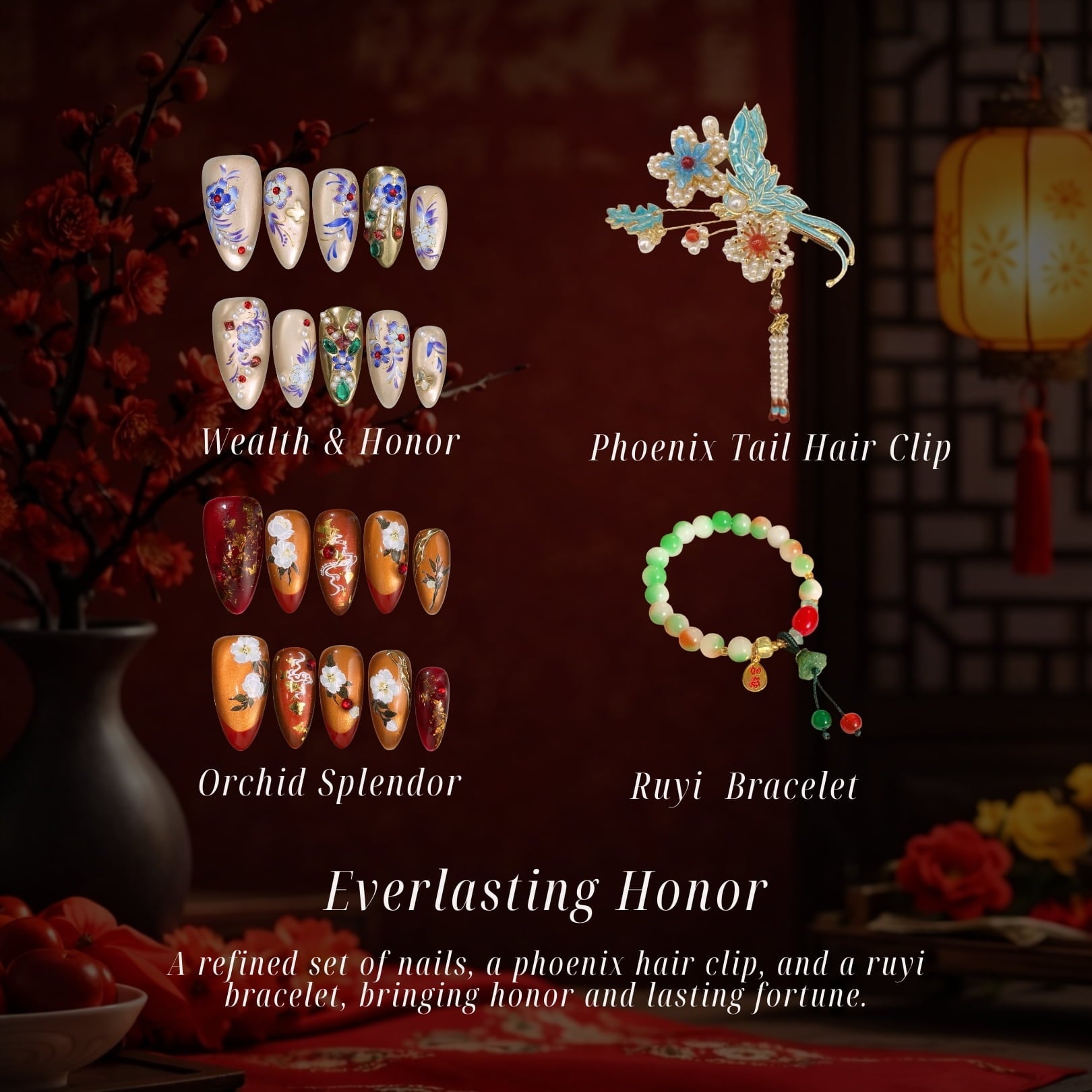 Everlasting Honor by Ersa Nails unites richly detailed press-on nails with a phoenix hair clip and a ruyi bracelet in a composition inspired by tradition and enduring beauty. Symbolizing honor, prosperity, and continuity, this set is designed to carry a sense of confidence and lasting fortune through refined craftsmanship and timeless motifs.