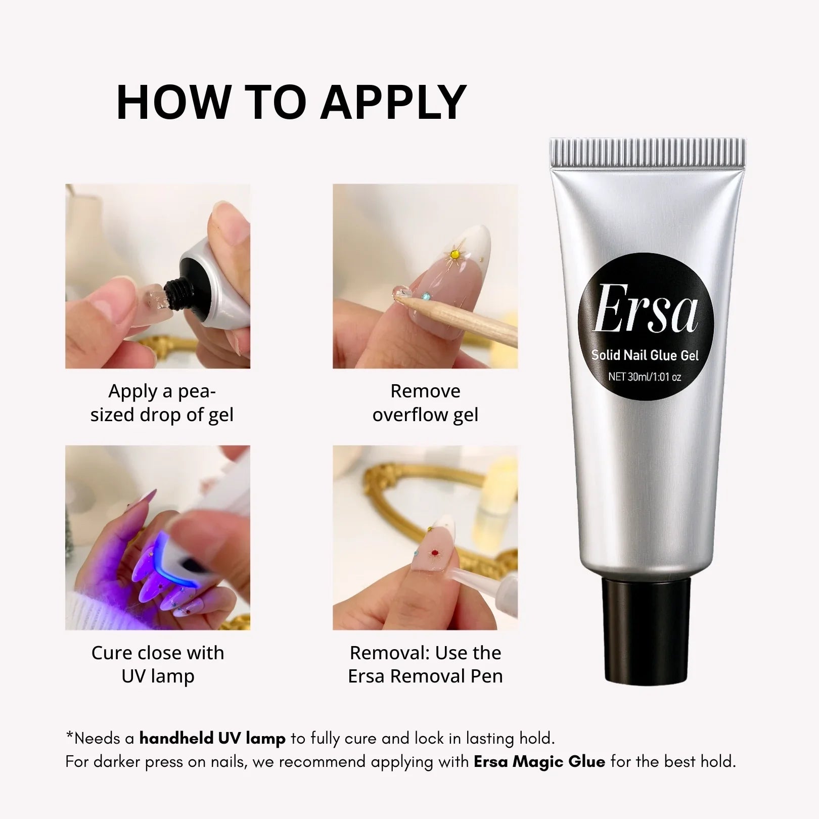 - When you're all in for extended elegance. Apply with our specialized gel nail glue and seal with a UV lamp. Get the set here!