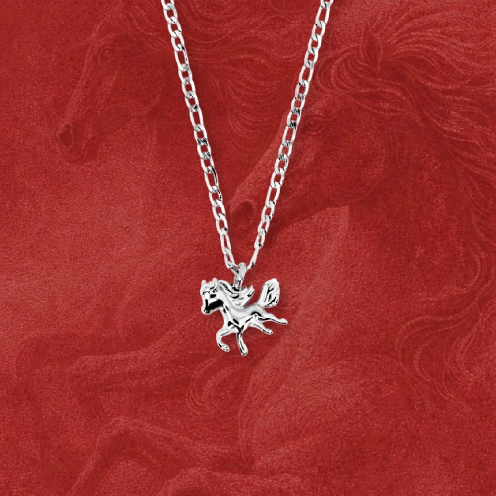 A tribute to the Year of the Horse, this necklace features a horse mid gallop. A symbol of freedom, drive, and unstoppable momentum. The pendant hangs from a figaro chain that catches the light, making it a striking everyday statement or a meaningful gift.